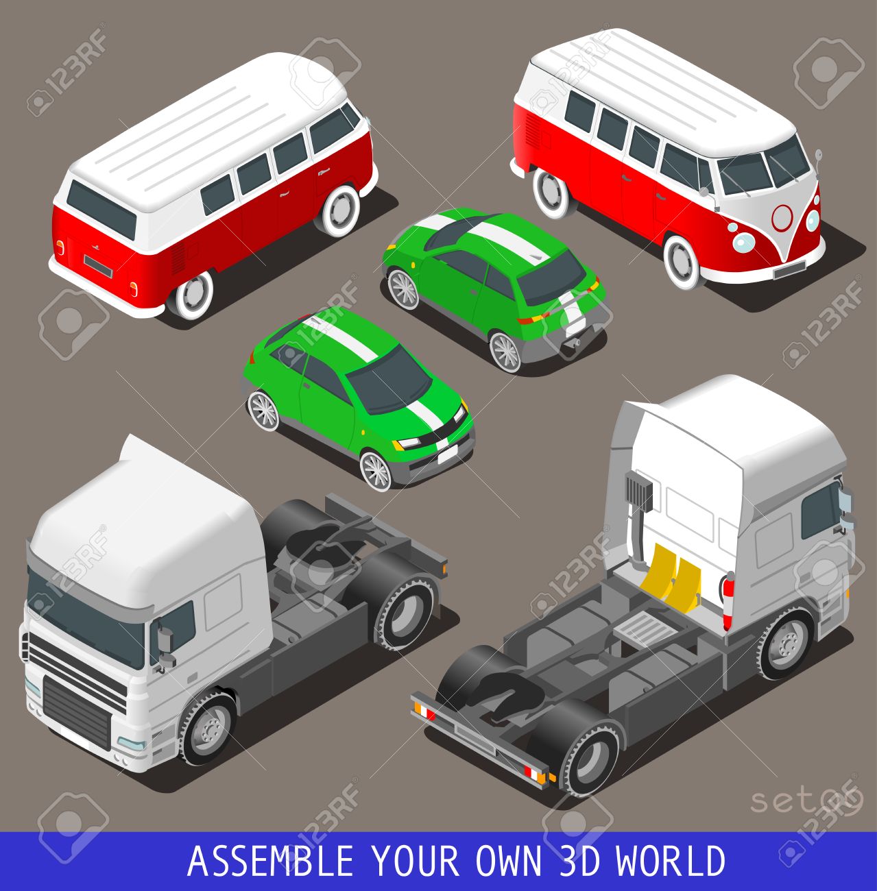 Flat 3d Isometric High Quality Vehicle Tiles Icon Collection Car And Truck Driving Only Hippy Van Assemble Your Own 3d World Web Infographic September Royalty Free Svg Cliparts Vectors And Stock Illustration